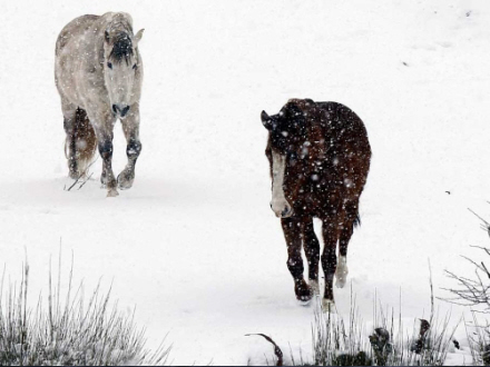 To heste kæmper sig gennem sneen i Alto Campo, Cantabria