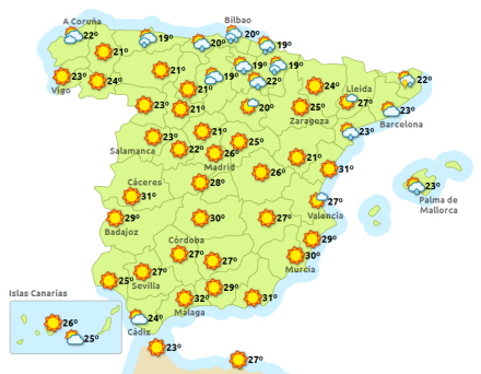 I alt kan hele 28 provinser se frem til havne på den lune side af de 30 grader, og ud af dem er de syv i forhøjet alarmberedskab niveau gul. Det drejer sig om: Madrid (36), Albacete (37), Toledo (38), Cuenca (35), Málaga (36) og Almería (30). Gerona og Barcelona er også i forhøjet alarmberedskab, men her handler det derimod om regn og uvejr.