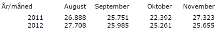 Man sammenligner de månedsvise tal i august, september, oktober og november i henholdsvis 2011 og 2012.