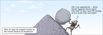 Sisyfos-myten stammer fra den græske mytologi. Sisyfos var konge af Korinth, men blev dømt til for evigt at rulle en sten op ad en bjergside. Hver gang han næsten er ved toppen, triller stenen fra ham, og han må starte forfra - et sisyfosarbejde.