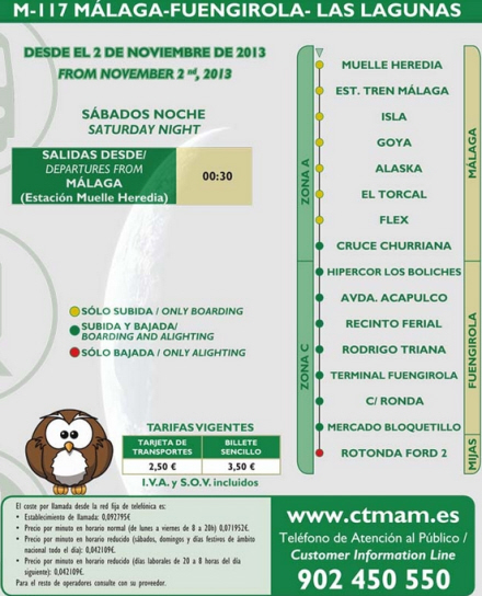 Ruten M-117 kaldes ”Natuglen” og har præmiere i morgen den 2. november med afgang fra Muelle Heredia klokken 00:30. Den skal forbedre forbindelsen til provinshovedstaden for besøgende i Málaga, der ikke har lyst til at tage bilen efter en tur i bigrafen, teateret eller i byen på et tidspunkt, hvor der ikke længere kører hverken busser eller tog.