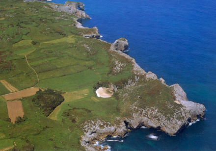 Vandet trænger ind gennem nogle naturlige tunneller, og fosser ned i ”lagunen”, der er omgivet af grønne marker, kun 50 meter fra stranden i Llanes.