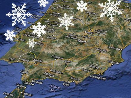 I Cantabrien, Pyrenærerne og i Centralspanien kommer den første vintersne. Her er snegrænsen faldet til 1000 meter, og der kan i løbet af i dag falde op til otte centimeter sne.