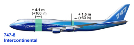 Jumboen er gjort 4,1 meter længere, hvor der er to etager og 1,5 meter længere bag vingerne.