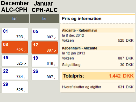 Spanien i Dag har foretaget et pristjek på en typisk juleflyvning for en Alicante-dansker. Vi har holdt os til lørdagene med de direkte flyvninger og valgt afrejse fra Alicante (ALC) den 8. december med retur fra København (CPH) den 12. januar.