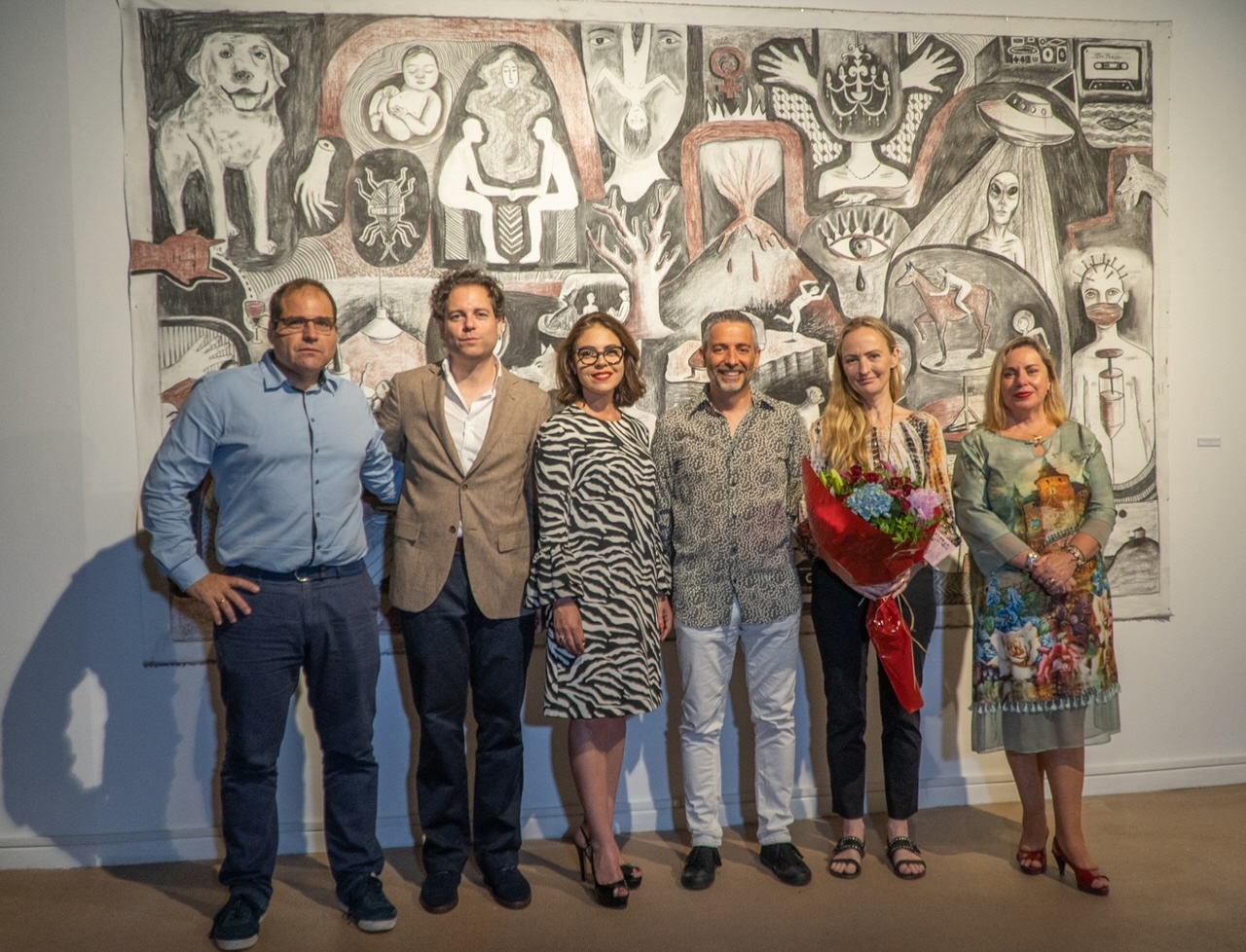 Ved fernisering i maj foran en af Carolines store kultegninger. Fra venstre til højre: Antonio Montesino (udstillingstekniker), Francisco Arce (viceborgmester), Gema Laguna Bermúdez (kulturrådmand), Juan Bautista Salado Escaño (museumsdirektør), Caroline Krabbe og Marisa Moreno Castillo (dansk konsul).