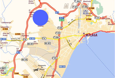 Den blå cirkel viser, hvor det nye stadion måske opføres i Puerto de la Torre. Intet er dog afgjort på nuværende tidspunkt.