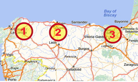 1: Galicien, 2: Asturien og 3: Baskerlandet