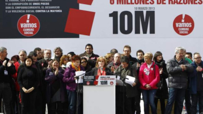 Under sloganet ”mod arbejdsløshed - seks millioner grunde” deltog mere end 150 organisationer herunder fagforeninger i ”det sociale topmøde”, der samlede i alt op mod 300.000 mennesker i gaderne i Catalonien, Madrid, Valencia og Asturien.