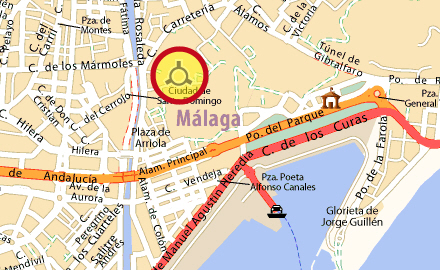 Museets beliggenhed i Málagas centrum. Klik her for at komme til interaktivt kort på viamichelin