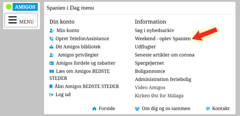 Klik i Menu øverst til højre på Spanien i Dag og vælg Weekend - oplev Spanien