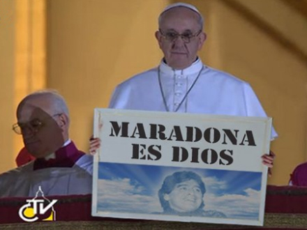 Som det viste foto af Francisco I – vi holder os til hans spanske navn – der foran sig holder en planche, hvor der står, at 'Maradona er Gud'.