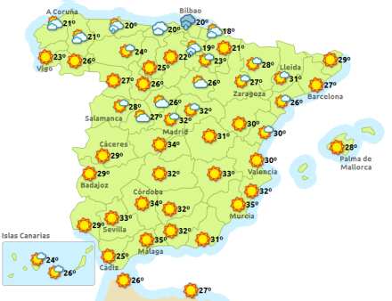 Madrid har i dag solrigt vejr med 19 til 35 grader, Barcelona, letskyet og 21 til 26 grader, Valencia ligeledes letskyet og 20 til 29 grader, Málaga får i dag ret solrigt vejr med svag vind og mellem 22 og 28 grader.