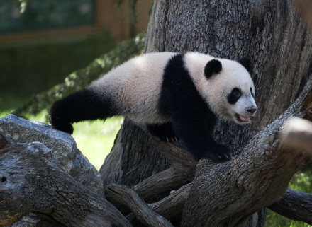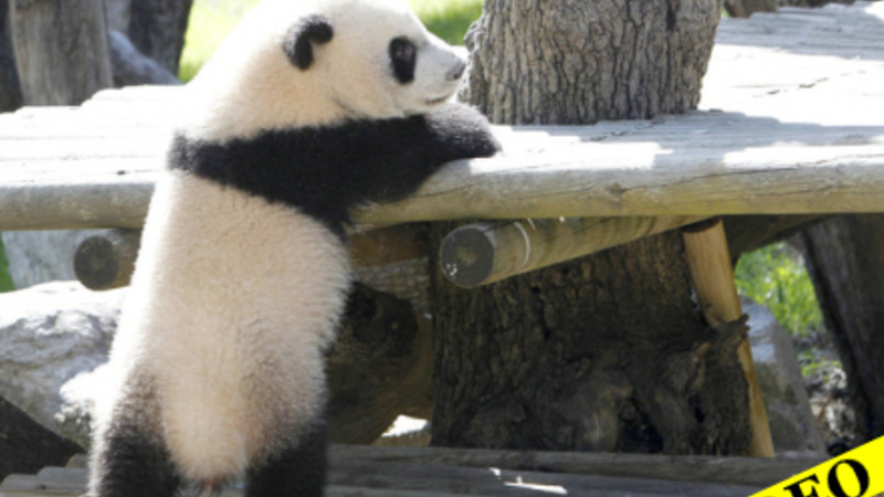 Ledsaget af sin mor kravlede den 15 kilo tunge panda-bayen over på et særlig klatrestativ og sprang ud i forårssolen – til stor begejstring for tilskuerne.