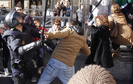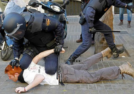 En video, der ligger på flere spanske aviser, viser politiets noget hårdhændede behandling af demonstranterne, i et enkelt tilfælde ser man betjente smække to unge kvinder op mod en bil.