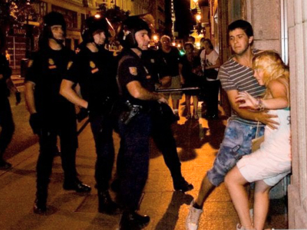 Videoen viser mindst otte betjente i kampuniform krydse en vej i det centrale Madrid. Bagfra, kan man se en betjent slå sin arm ud mod en piges ansigt, men om han prøver at standse hende eller slår hende, er lidt uklart. Hun ryger tilbage, som om hun bliver ramt, men kameravinkelen i kontaktøjeblikket gør, at man ikke ser det præcist. Idet en mandlig ven slæber pigen væk, kan man se mindst én politimand slå ham bagfra med sin politistav.