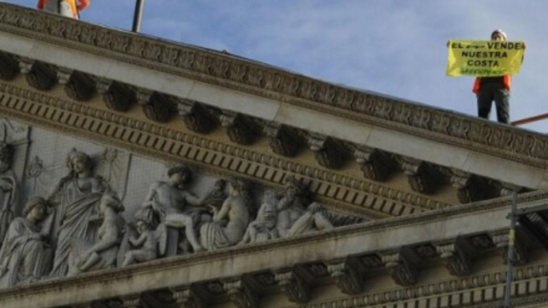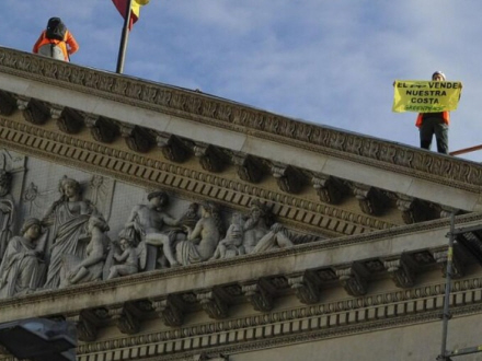 Otte Greenpeace aktivister kravlede i går op på taget af Kongressen i Madrid – hvor loven blev vedtaget – for at vise deres protest mod den ulovlige ejendomsspekulation i landet.