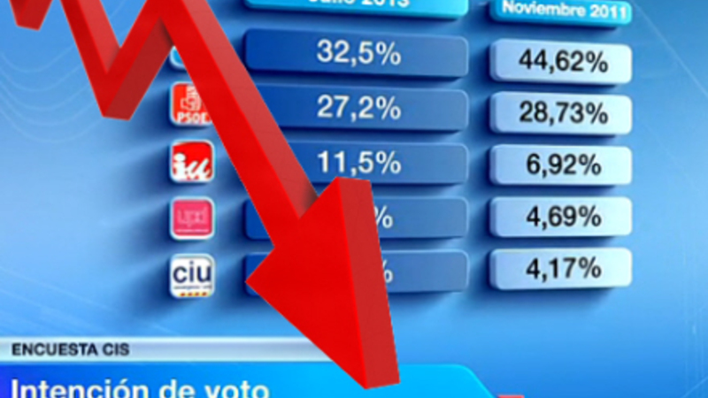 PP står til 32,5 af stemmerne, mens PSOE må nøjes med 27,2 procent. Venstrefløjskoalitionen IU står til 11,5 procent, mens Unión Progreso y Democracia (UPyD) hiver sig helt op på 8,8 procent. Det catalanske regeringsparti CiU holder sig på 3,1 procent, ERC på 2,3 og baskiske Amaiur og PNV står til hver 1,4 procent.
