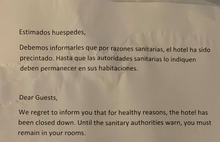 Papiret her er hængt op på hotellet og informerer om, at hotellet er lukket ned, og gæsterne skal forblive på deres værelser, indtil sundhedsmyndighederne siger andet. Det står også på fransk og italiensk