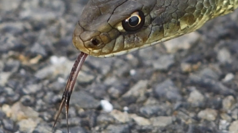 Da han gik hen for at undersøge, hvad der foregik, så han, at en slange kravlede rundt og var på vej ud i trafikken.