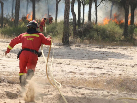 Lige nu knokler over 500 brand- og militærfolk med at få styr på skovbrand, der lørdag brød ud i Moguer tæt ved naturparken Doñana i Andalusien, Sydspanien. Fra luften arbejder fem fly og ni helikoptere lige nu.