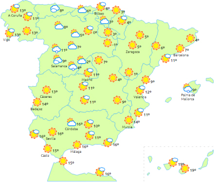 Letskyet til klar himmel. Stigende temperaturer med svag frost i regionerne Antequera og Ronda. Ellers hedder det 11 til 18 grader om dagen og seks til 10 om natten. Vind fra nord.