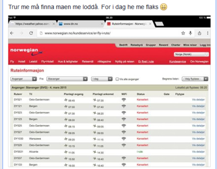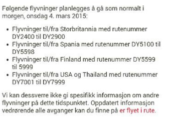 På samme facebookside for nordmænd i Spanien bliver der pludselig oplyst, at et fly fra Trondheim med destination Alicante i dag er aflyst samt en anden ligeledes fra Norge og med samme, spanske destination.