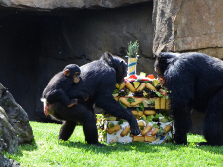 Foran publikum fik den lille chimpanse sammen med sin familie lækre delikatesser og gaver.