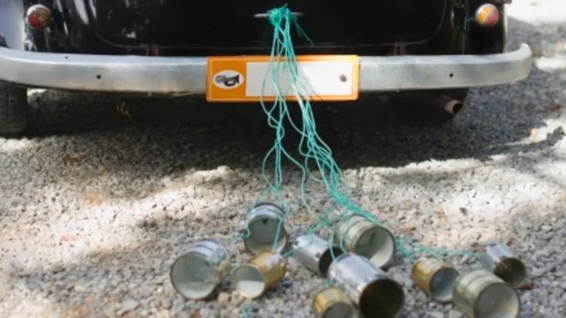 Biltyven fastgør ganske enkelt et par tomme sodavand til en snor, der så siddet fast bag på bilen.