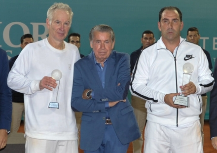 John McEnroe og Albert Costa med deres trofæer i glas flankerer Manolo Santa