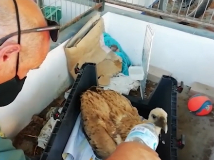 Seprona tog straks til stedet. Der fandt de den store grib i vejsiden, og den kunne hverken flyve eller bevæge sig. Den viste tydelige tegn på dehydrering og underernæring samt en voldsom parasitinfektion. Derfor besluttede betjentene resolut at tage den med hjem til den lokale politistation i Morón de la Frontera.