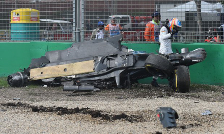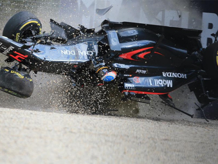 Det højre forhjul på Alonsos McLaren-racer blev straks smadret, og han mistede kontrol over bilen. Den hamrede ind i barrieren og spandt rundt i luften, før den blev stoppet af endnu en barriere.