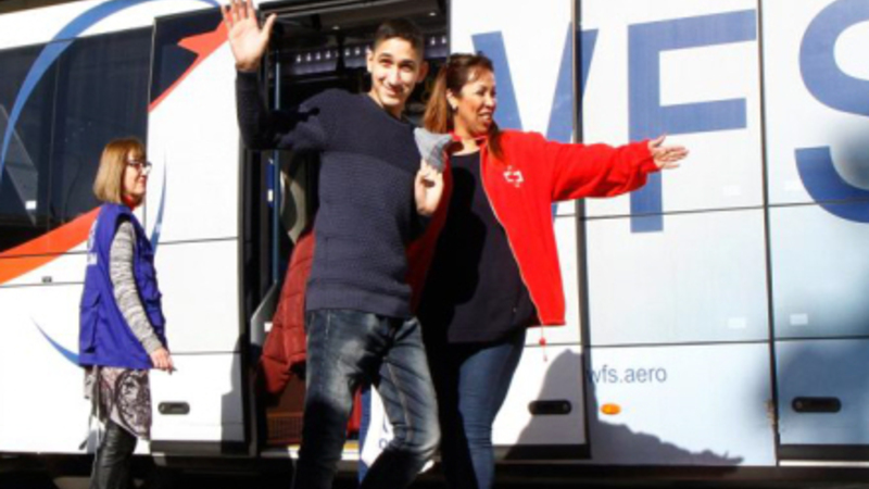 Man kan da kun blive glad af at se videoen, fra da de steg af bussen. Den spanske Røde Kors-medarbejder er ikke nærig med opmuntrende klap på armen og at sige velkommen.