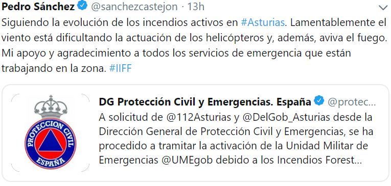 Situationen blev så slem i løbet af søndagen, at selv premierministeren, Pedro Sánchez, kontaktede lederen af den asturiske regering, Javier Fernández, og altså lovede at stille alt nødvendigt til rådighed. Han tweetede også sin støtte: