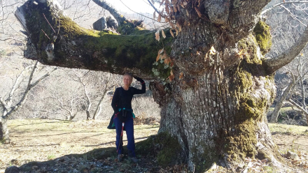 Rejseleder Pia ved et af de 500-år gamle kastanjetræer