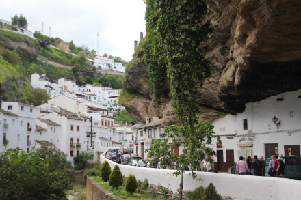 Undervejs gør vi stop i grottebyen Setenil de la Bodegas, der er bygget ind i siderne af klippen. Vi ser 'Solgaden' og 'Skyggegaden', der ligger på hver sin side af kløften og får tid en kop kaffe på en af de barer, der er bygget inde i klippen.