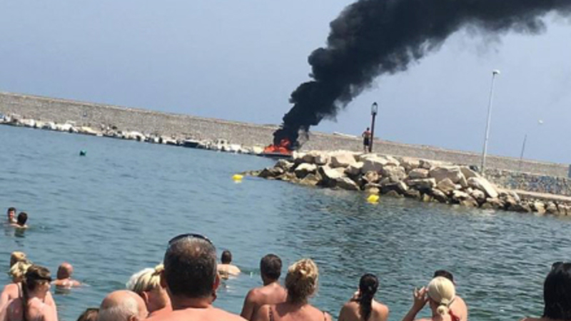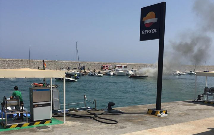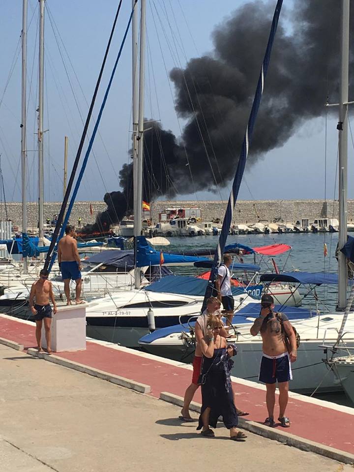 VIDEO: Netop nu er brandfolk i gang med at slukke en voldsom bådbrand i Fuengirola Havn foran tusindvis af strandgæster.