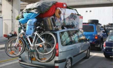 Og med en fyldt bil og oppakning på taget, som vist på billedet, kan man godt mistænke, at bilens tilladte totalvægt er godt og vel overskredet. Så er det, at motorcykelbetjenten lige trækker nogle vægte op af sidetaskerne, og således blev den rejse bragt til ende.