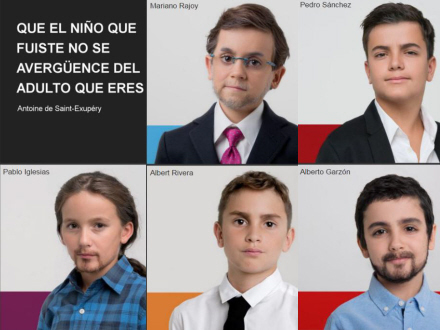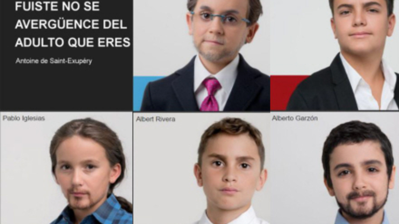 På plakater og den tilhørende video ses børn klædt ud som politikere fra de fem største partier i Spanien. Her ses blandt andet Premierminister Mirano Rajoy (PP), lederen af det socialistiske parti Pedro Sánchez (PSOE) og Podemos-leder Albert Rivera som miniature udgaver af dem selv.