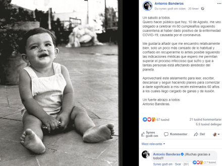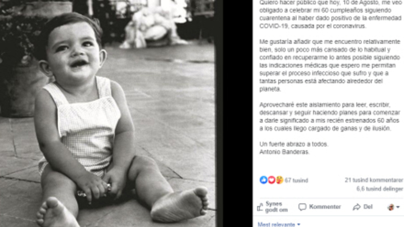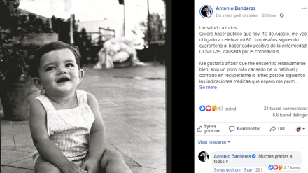 KENDTE: I går fyldte Antonio Banderas 60 år, og han brugte anledningen på at afsløre, at han er corona-smittet. Men han pakkede den triste nyhed ind i et ret nuttet billede af sig selv.