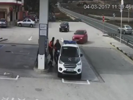 To betjente fra Guardia Civil stod ganske fredeligt og fyldte tanken i deres patruljevogn, mens en tredje kollega ventede inde i bilen.