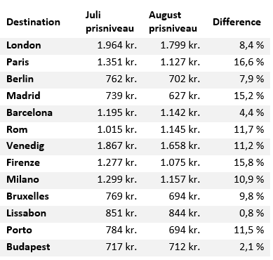 Højdespringeneren – eller ”lavdespringeren” om man vil – er Paris, hvor priserne er faldet med hele 16,6 procent siden juli. Her slipper man i snit med 1.127 kroner for en overnatning for to personer på dobbeltværelse i august, mens det samme kostede 1.964 kr. i juli.