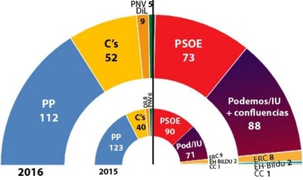 Både Mariano Rajoy (PP) og Pedro Sánchez (PSOE) får smæk og mister henholdsvis 11 og 17 mandater. Det var jo også de to kamphaner, der ikke kunne finde ud af at danne en bred regering på grund af egne forfængeligheder.