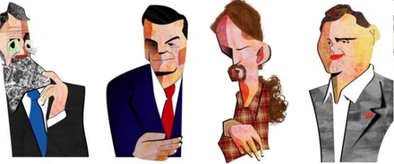 Illustration af parti-lederne Rajoy, Sánchez, Iglesias og Rivera