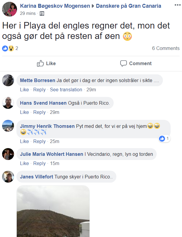 Og det er ikke ovre endnu. I dag er Tenerife, Gran Canaria, Lanzarote og Fuerteventura i gult alarmberedskab for regn. Varslet går indtil videre frem til klokken 15, og på facebook kan vi da også allerede konstatere, at der er godt gang i den på Gran Canaria: