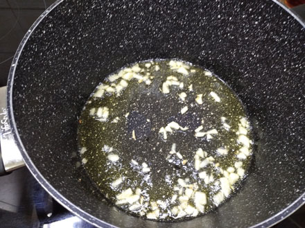 Kom olivenolie i en slip-let grydep så bunden er dækket, og brun hvidløgene