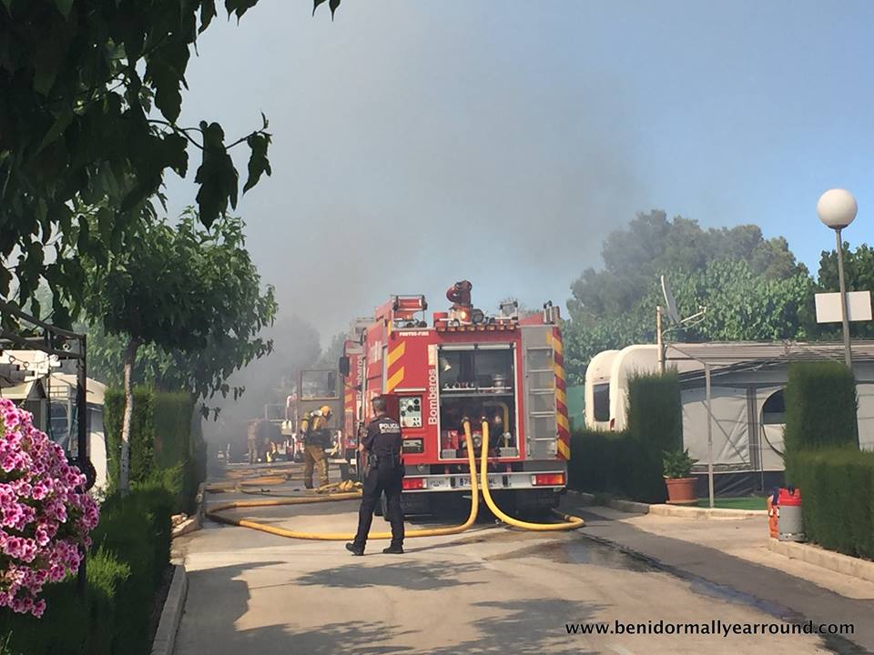 Flere end hundrede turister måtte i går eftermiddag evakueres fra campingpladsen “El Racó de Benidorm”, da en kraftig brand brød ud.