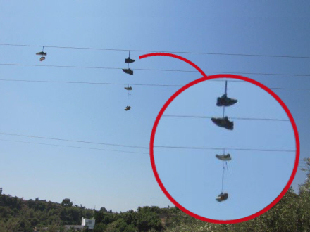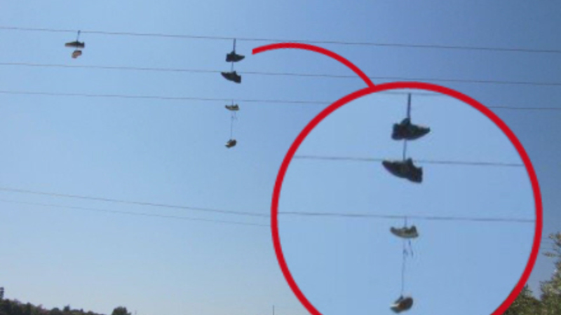 Et 200 meter langt el-kabel, som var blevet dynget til med sko, faldt til jorden tæt ved et sted, hvor biler holdt parkeret.