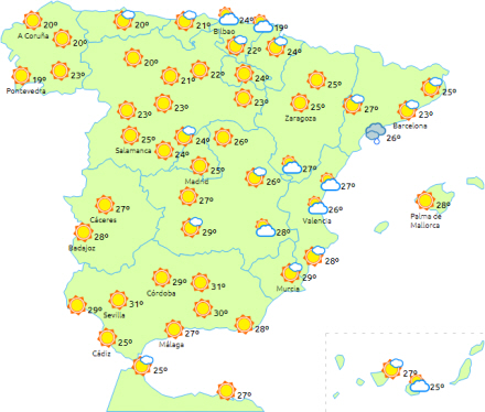 Letskyet eller klar himmel bortset fra perioder med overskyet himmel og morgentåge ved kysten. Stigende temperaturer i de indre egne og få ændringer i resten. Dermed havner vi på noget, der ligner 26 til 30 grader og 15 til 21 i nat. Let vind fra skiftende retninger.