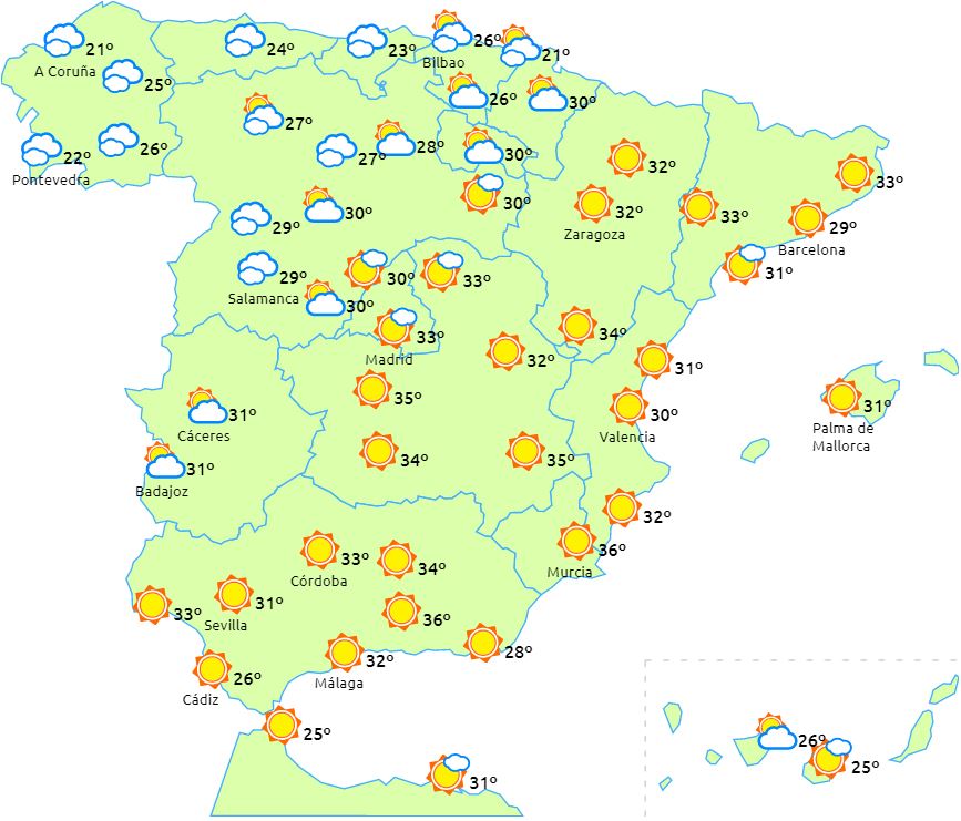 Temperaturer med få ændringer, så vi ligger fortsat i den meget lune ende af skalaen med markant høje temperaturer i halvøens østlige, indre egne og på Balearerne.